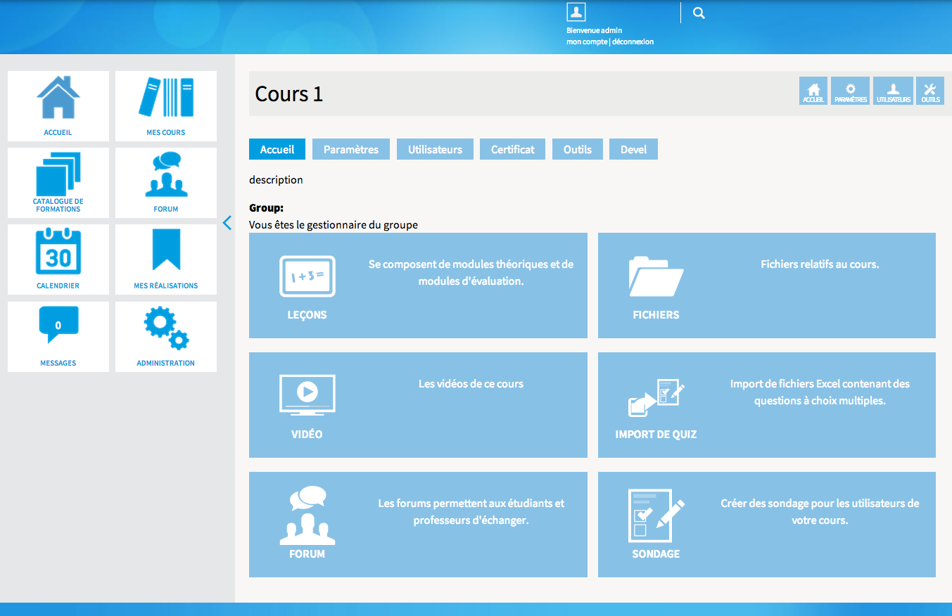 - Possibilité de regrouper les cours au sein de classes, afin de constituer un cursus de formation